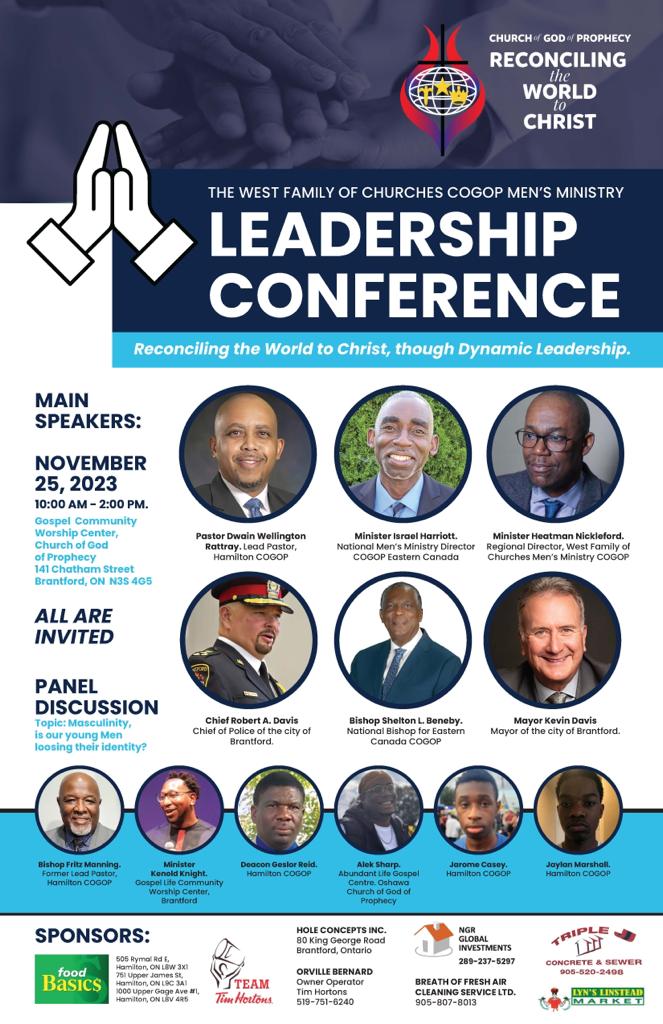 Félicitations au ministre Heatman Nickleford, à son équipe et à la West Family of Churches pour la conférence sur le leadership masculin, pleine d’esprit, informative et stimulante. Les églises suivantes de la région de l’Ouest ont participé : Hamilton COGOP, Gospel Life Worship Center (Brantford), Liberty Worship Centre (Kitchener) et Niagara Region COGOP.